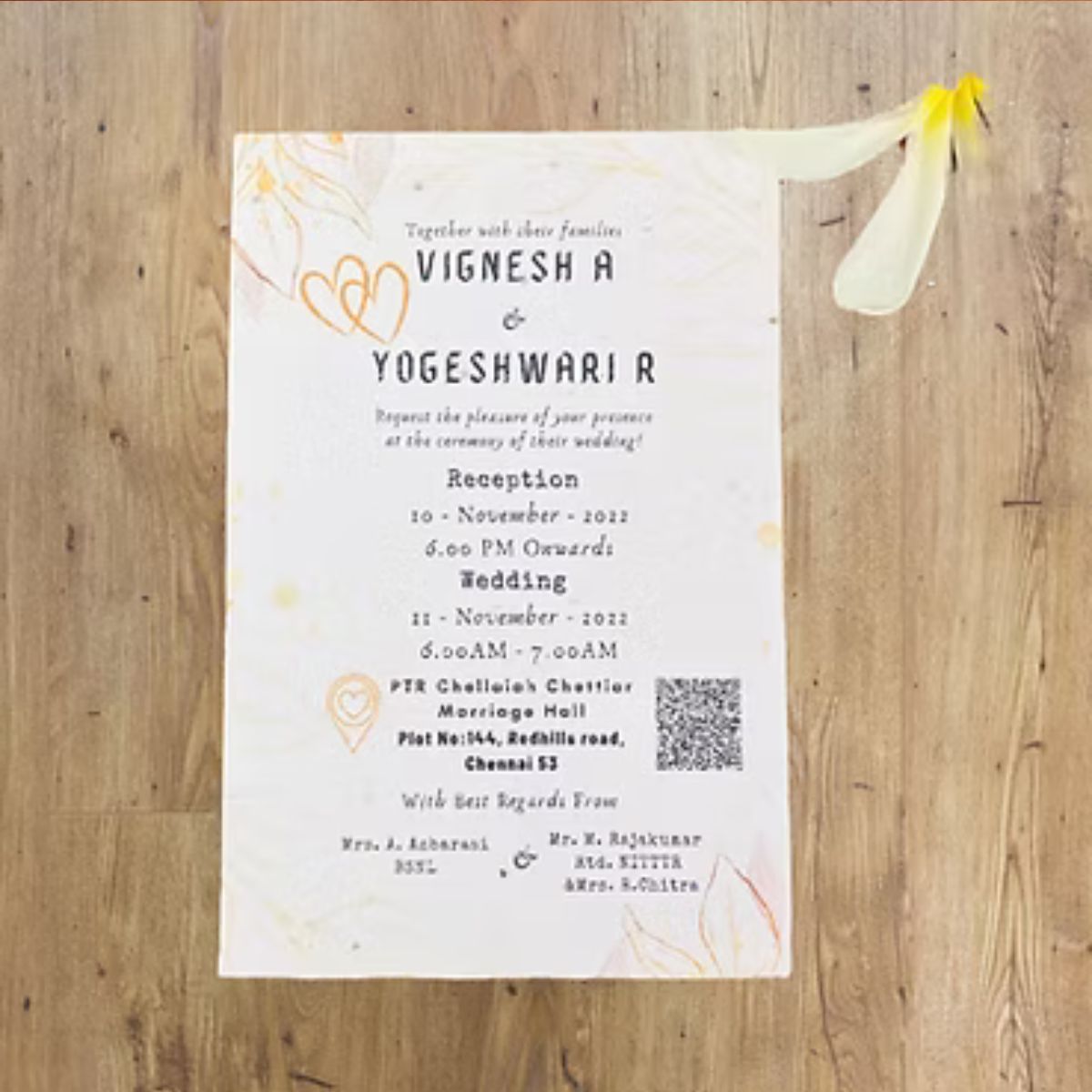 The card showcases a minimalistic design with botanical accents, modern typography, essential details, a QR code with plantable seed. The floral elements add charm, while eco-friendly messaging promotes sustainability.
