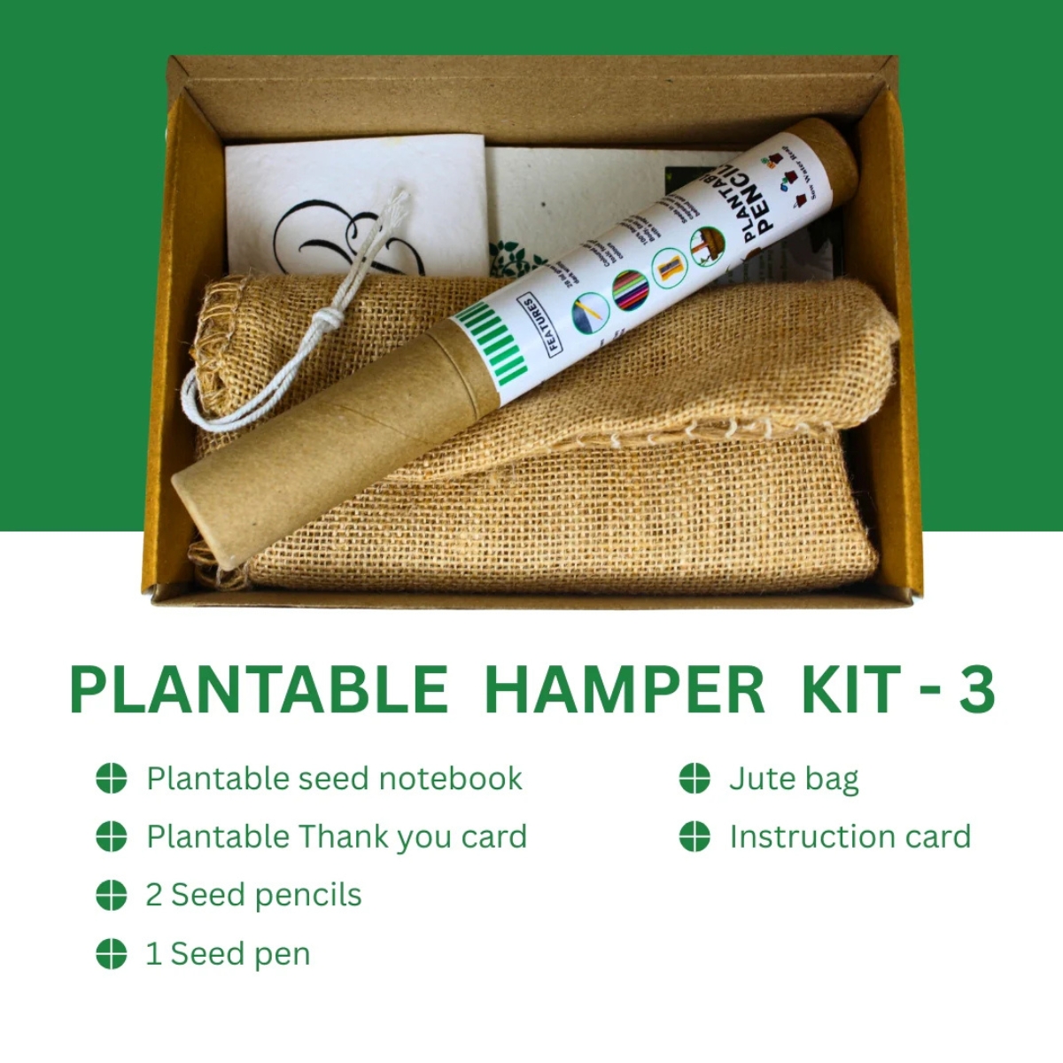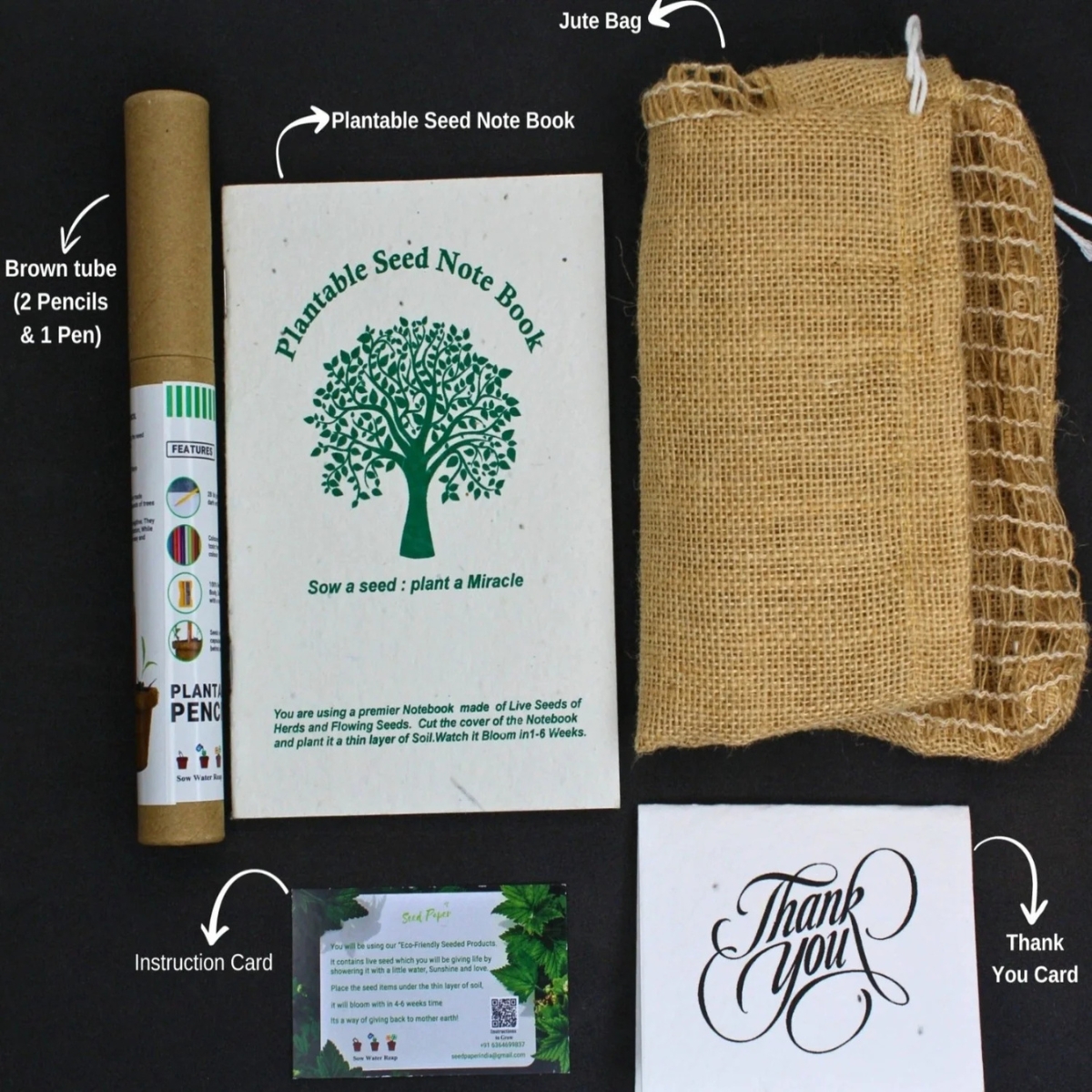 - Complete Sustainability:Β From the seed paper notebook to the jute bag, every item in this pack is crafted from eco-friendly materials, promoting sustainability and reducing your ecological footprint.