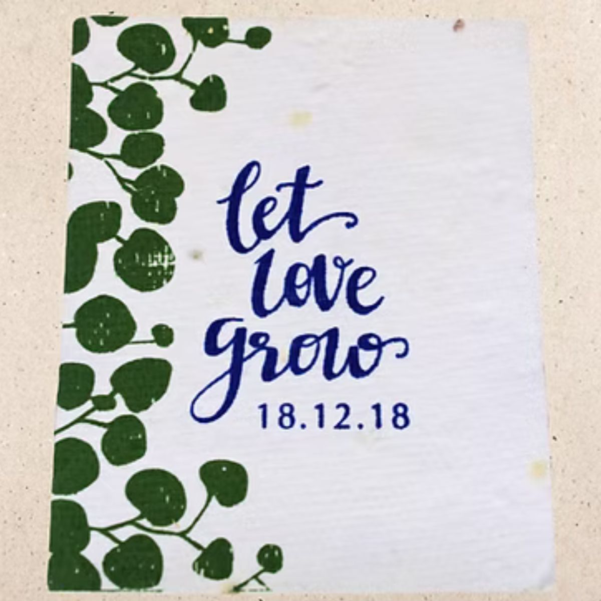 The card showcases a minimalistic design with botanical accents, modern typography, essential details, a QR code with plantable seed. The floral elements add charm, while eco-friendly messaging promotes sustainability.