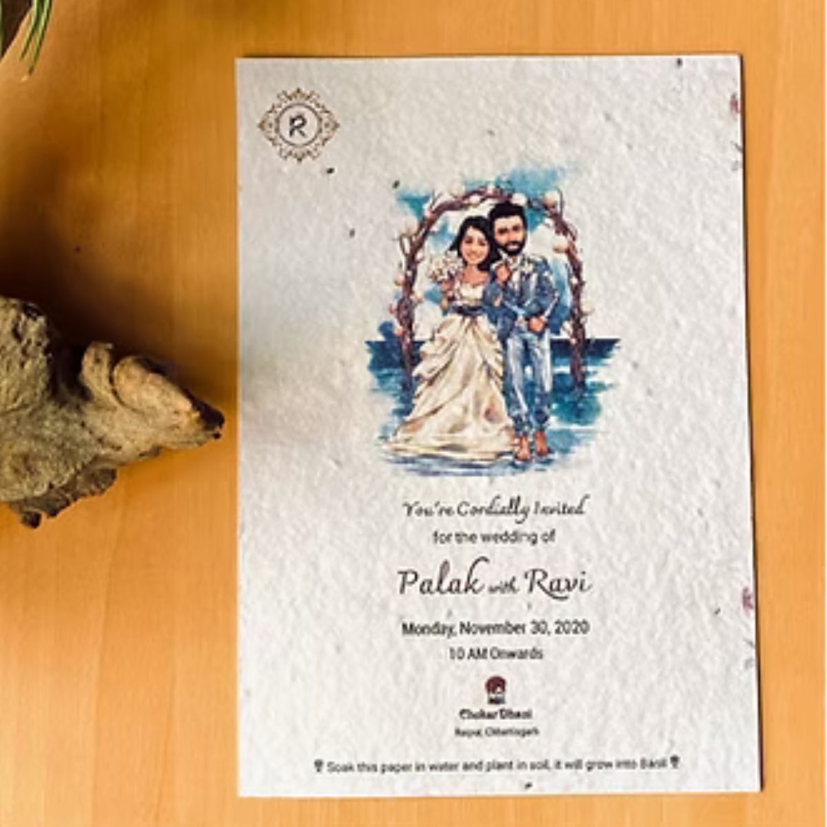 The card showcases a minimalistic design with botanical accents, modern typography, essential details, a QR code with plantable seed. The floral elements add charm, while eco-friendly messaging promotes sustainability.