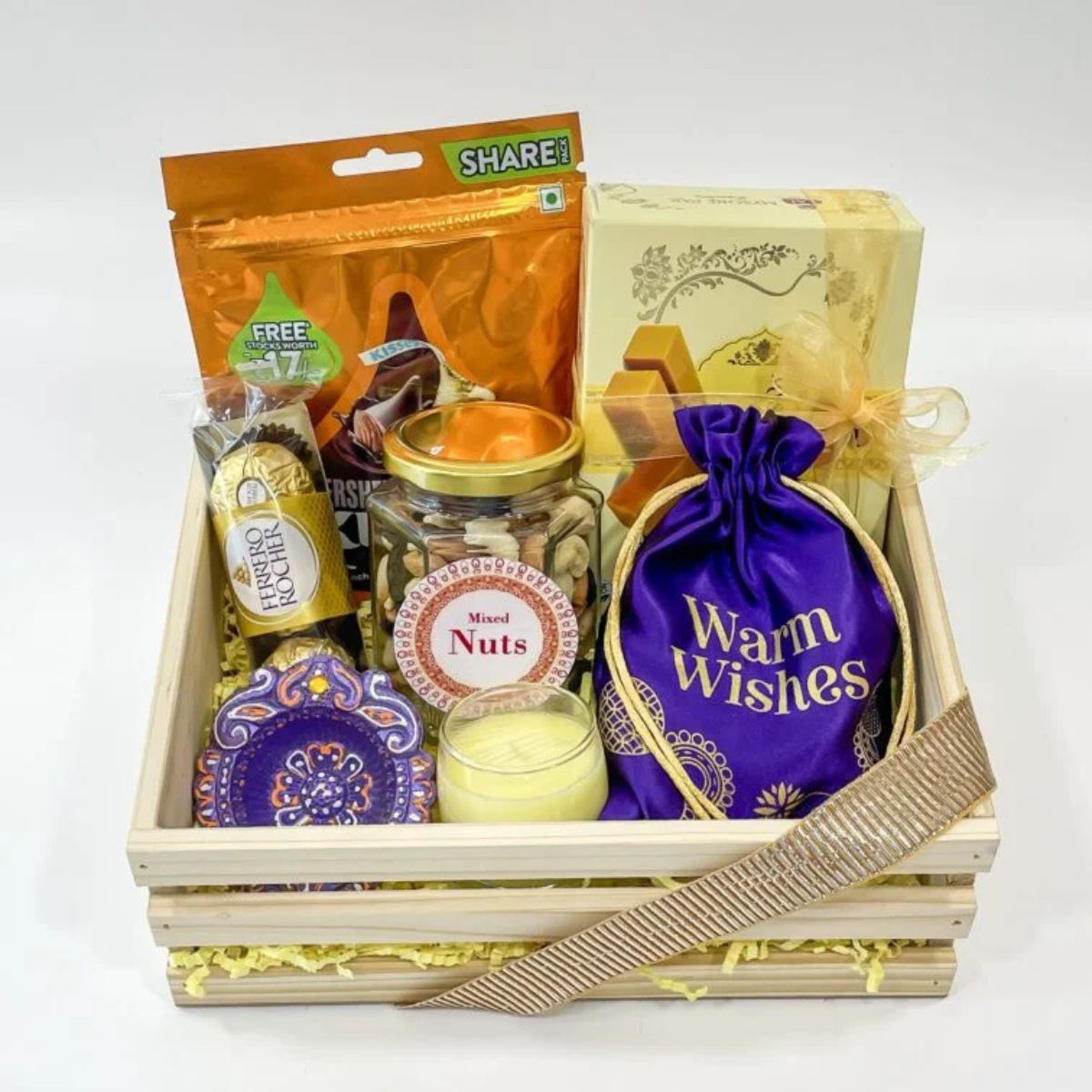 A charming wooden tray hamper filled with premium chocolates, mixed nuts, festive treats, and a soothing candle. Elegantly arranged with a “Warm Wishes” pouch for a heartfelt touch. Perfect for festivals, celebrations, or corporate gifting. A delightful blend of sweetness, warmth, and thoughtful presentation.
