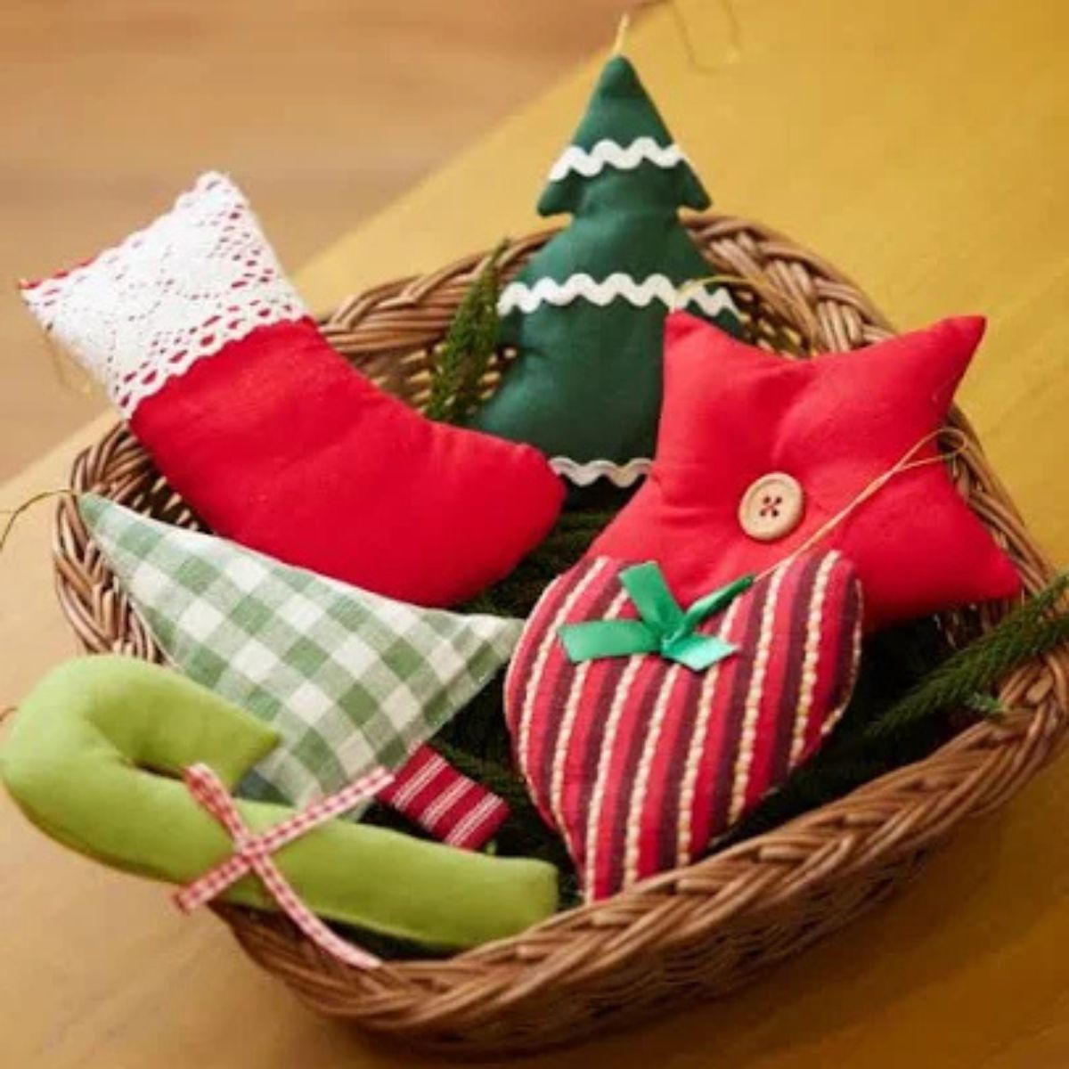 This charming handmade Christmas gift basket features adorable fabric decorations including stockings, hearts, stars, and a festive tree, crafted with soft, colorful materials. Beautifully arranged in a woven basket, it brings a warm and joyful holiday feel. Perfect for Christmas gifting, home dΓ©cor, kidsβ gifts, or festive displays, this set adds a cozy, handmade touch to seasonal celebrations and spreads holiday cheer.