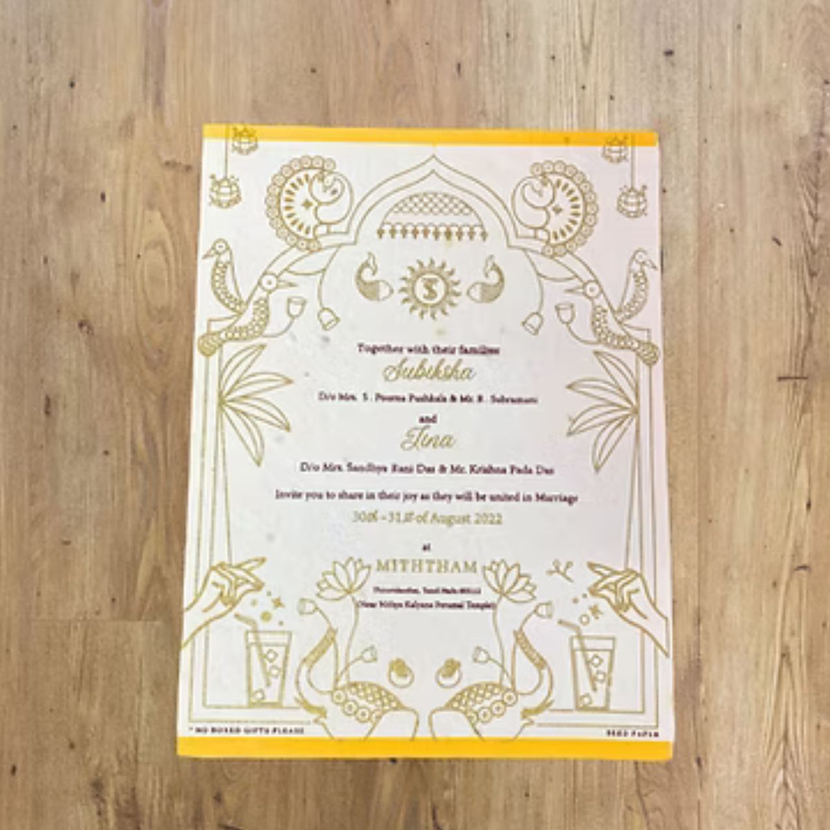 The card showcases a minimalistic design with botanical accents, modern typography, essential details, a QR code with plantable seed. The floral elements add charm, while eco-friendly messaging promotes sustainability.
