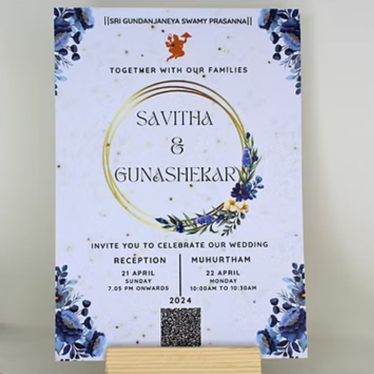 The card showcases a minimalistic design with botanical accents, modern typography, essential details, a QR code with plantable seed. The floral elements add charm, while eco-friendly messaging promotes sustainability.