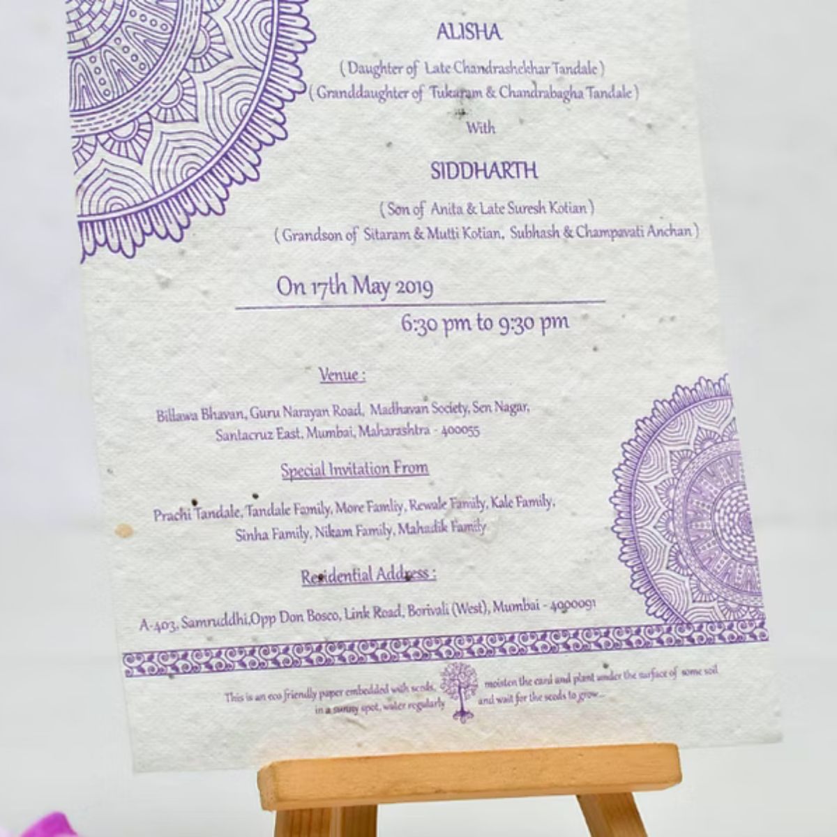 The card showcases a minimalistic design with botanical accents, modern typography, essential details, a QR code with plantable seed. The floral elements add charm, while eco-friendly messaging promotes sustainability.