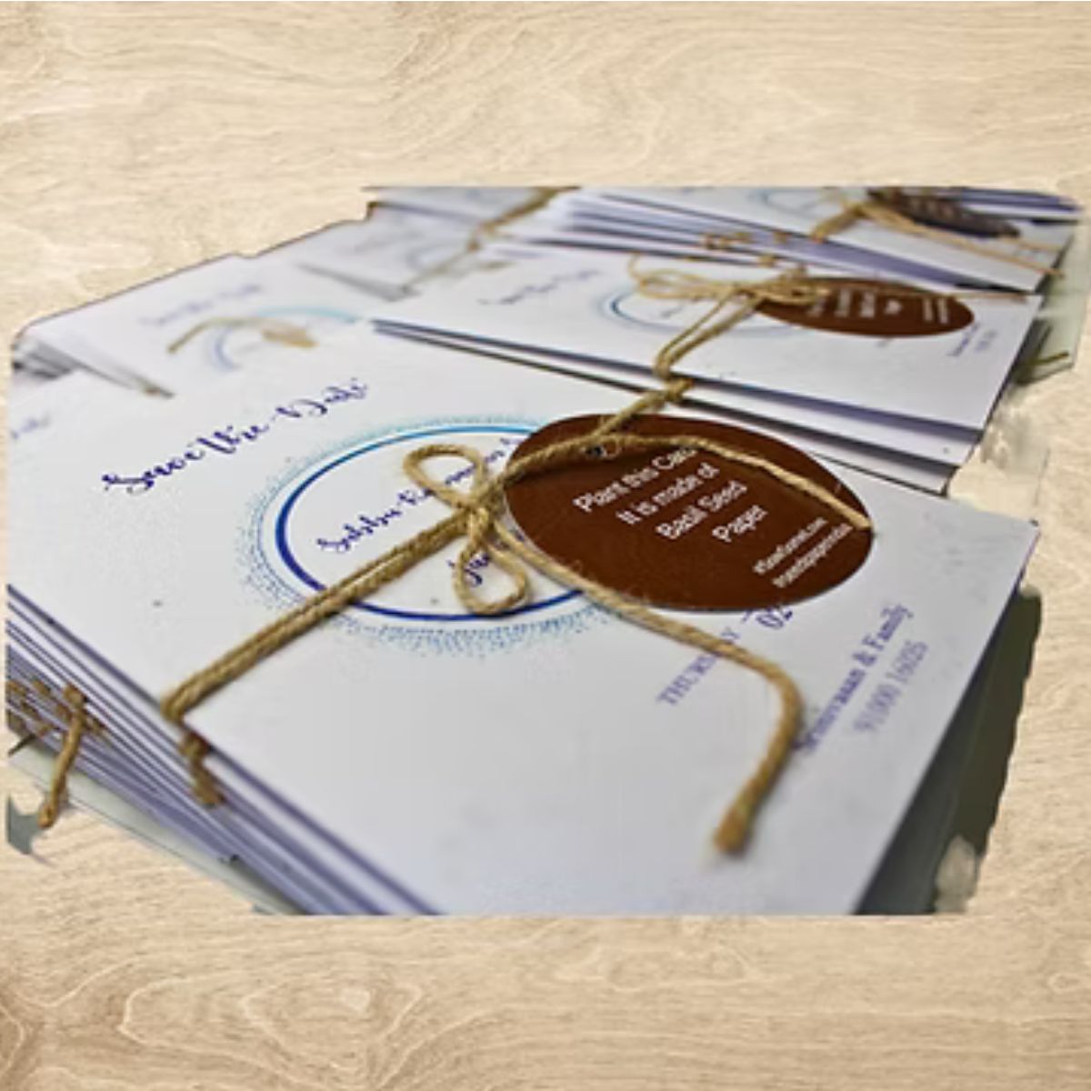 The card showcases a minimalistic design with botanical accents, modern typography, essential details, a QR code with plantable seed. The floral elements add charm, while eco-friendly messaging promotes sustainability.